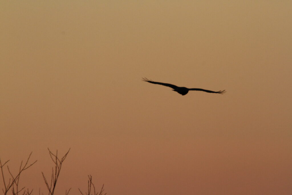 Ein einzelner Vogel, hoch oben in der Luft – kaum mehr als ein Schatten gegen den weichen Schein der untergehenden Sonne. Kein Laut, nur das unsichtbare Rauschen des Windes, der ihn trägt. Seine Schwingen weit geöffnet, fast regungslos. Es ist, als würde er schweben – zwischen Himmel und Erde, zwischen Tag und Nacht, zwischen Sichtbarem und Unsichtbarem.